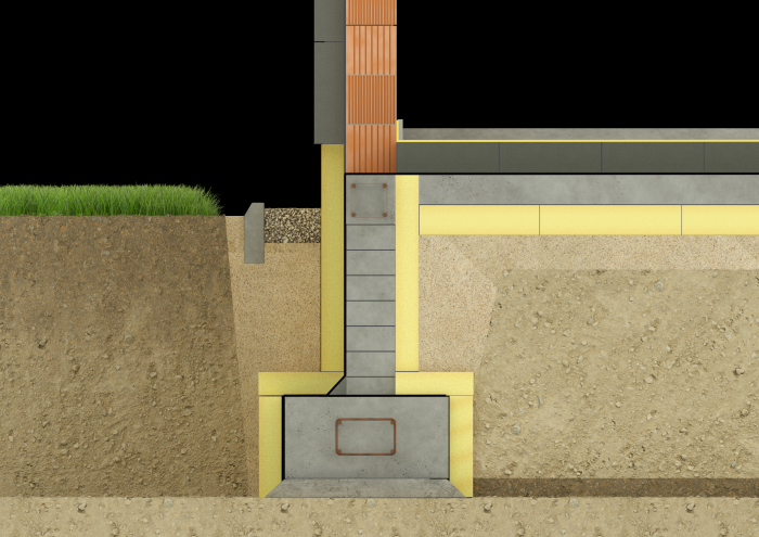Drugim kluczowym aspektem jest ochrona cieplna strefy przyziemia. Izolacja fundamentów wpływa bezpośrednio na bilans energetyczny budynku. Brak izolacji prowadzi do powstawania mostków cieplnych wzdłuż ścian fundamentowych, strefy cokołu oraz na styku podłogi z gruntem, co powoduje wychładzanie przegrody, kondensację pary wodnej, a w konsekwencji rozwój pleśni. Zastosowanie termoizolacji fundamentów stabilizuje temperaturę strefy przyziemia, poprawia efektywność energetyczną budynku i wpływa na mniejsze zużycie energii grzewczej.